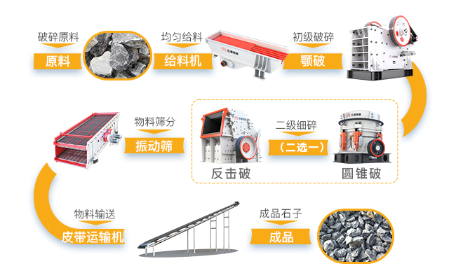 大塊石料經(jīng)料倉(cāng)由振動(dòng)給料機(jī)均勻的送進(jìn)顎式破碎機(jī)進(jìn)行粗碎,粗碎后的石料由膠帶輸送機(jī)送到反擊破/圓錐破進(jìn)行進(jìn)一步破碎,細(xì)碎的石料由膠帶輸送機(jī)送到振動(dòng)篩進(jìn)行篩分,篩分出幾種不同規(guī)格的石子,滿足顆粒要求的石子,由成品膠帶輸送機(jī)送往成品料堆,不滿足顆粒要求的石子,由返料膠帶輸送機(jī)送到反擊破/圓錐破進(jìn)行再次破碎,形成閉路多次循環(huán),成品粒度可按照用戶的需求,進(jìn)行組合和分級(jí),可配置輔助的除塵設(shè)備,綠色環(huán)保。