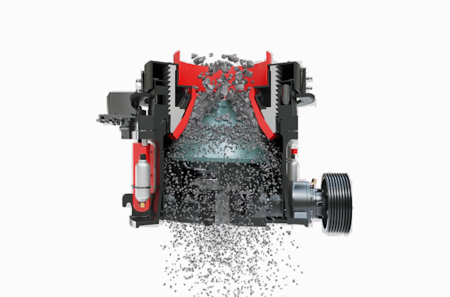 在工作時(shí)通過電動(dòng)機(jī)的旋轉(zhuǎn)帶動(dòng)帶輪或聯(lián)軸器、傳動(dòng)軸和圓錐部在軸心線下使偏心軸做周期性旋擺運(yùn)動(dòng)。在物料從料口進(jìn)入破碎腔后因受到偏心軸和軋臼壁的相互沖擊擠壓、研磨、揉搓從而產(chǎn)生破碎的作用。液壓保險(xiǎn)系統(tǒng)能在機(jī)器發(fā)生過鐵故障或者悶車現(xiàn)象時(shí)通過液壓將支撐套和定錐部排除出故障物,在起到很好的保險(xiǎn)作用的同時(shí)大大的降低了維修率及提高生產(chǎn)效率。